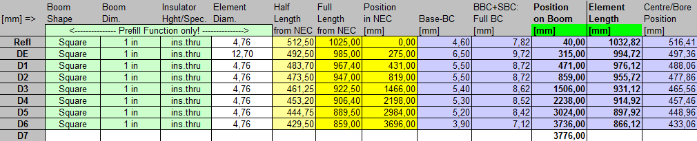 "Ready to saw and drill" data for mounting elements on boom with BC according DG7YBN for standard insulators as sold by Konni, Nuxcom, WiMo, 7arrays: