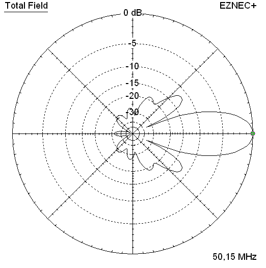 Gain vs. isotr. Rad. 18.7 dBi Gain vs. Dipole 16.6 dBD -3 dB H-plane 18.9 deg. -3 dB E-plane 22.0 deg. F/B -33.5 dB F/R -26.8 dBTheoretical numbers, no phasing line losses nor imperfections caused by H-frame included Competition & Comparison Comparing patterns with the G4CQM 6M7N50SY, which is an advanced design of equivalent length using a very tight driver cell. Despite that Derek managing to stick to his preference of 50 ohms impedance at the feedpoint. Derek and me had a little contest on designing a fine 1.4 wl 50 MHz Yagi. Both of us finally produced "mark 2" versions of our base designs on which we settled in a "mutual agreement". For those who are interested I have rolled out the full story "told in radiation patterns" per development step. 1. The new G4CQM vs. the original GTV By publishing his 7 ele. N50SY design Derek had raised the bar higher ...